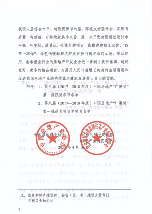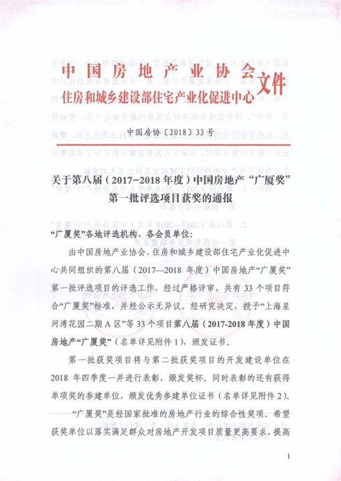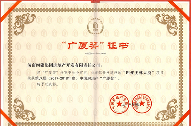 廣廈獎(jiǎng)是住建部設(shè)立的國(guó)家級(jí)獎(jiǎng)項(xiàng),也是我國(guó)房地產(chǎn)行業(yè)的綜合性大獎(jiǎng)。是由住宅與城鄉(xiāng)建設(shè)部頒發(fā),經(jīng)國(guó)務(wù)院批準(zhǔn)設(shè)立的國(guó)家級(jí)房地產(chǎn)獎(jiǎng)、行業(yè)內(nèi)最權(quán)威的房地產(chǎn)獎(jiǎng)項(xiàng)評(píng)選,相當(dāng)于魯班獎(jiǎng)、梁思成獎(jiǎng)、詹天佑獎(jiǎng),每?jī)赡暌淮危矸康禺a(chǎn)綜合開發(fā)行業(yè)的最高榮譽(yù)。旨在評(píng)選規(guī)劃設(shè)計(jì)水平高、環(huán)境好、質(zhì)量?jī)?yōu)、性能好、綠色低碳的老百姓滿意的好房子。“廣廈獎(jiǎng)”評(píng)定標(biāo)準(zhǔn)極其苛刻,包括規(guī)劃設(shè)計(jì)、建筑設(shè)計(jì)、施工質(zhì)量、性能、產(chǎn)業(yè)化技術(shù)應(yīng)用效果、物業(yè)管理等相關(guān)六大評(píng)價(jià)體系,其中涵蓋了數(shù)百個(gè)評(píng)價(jià)子項(xiàng)的通用及強(qiáng)制標(biāo)準(zhǔn)。四建地產(chǎn)秉持“責(zé)任國(guó)企、品質(zhì)筑家”的企業(yè)理念,榮膺第八屆中國(guó)廣廈獎(jiǎng),體現(xiàn)了其在房地產(chǎn)行業(yè)的綜合實(shí)力。