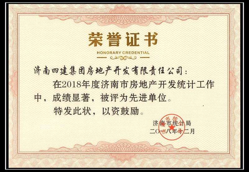 經(jīng)濟南市統(tǒng)計局審核,四建地產(chǎn)榮獲2018年度全市開發(fā)單位統(tǒng)計工作先進(jìn)單位稱號。今后,公司將繼續(xù)貫徹落實行業(yè)統(tǒng)計報表制度,進(jìn)一步提升統(tǒng)計服務(wù)的質(zhì)量和水平,為宏觀決策提供理論依據(jù),為把我市早日建設(shè)成為“大強美富通”的現(xiàn)代化國際大都市貢獻(xiàn)力量。