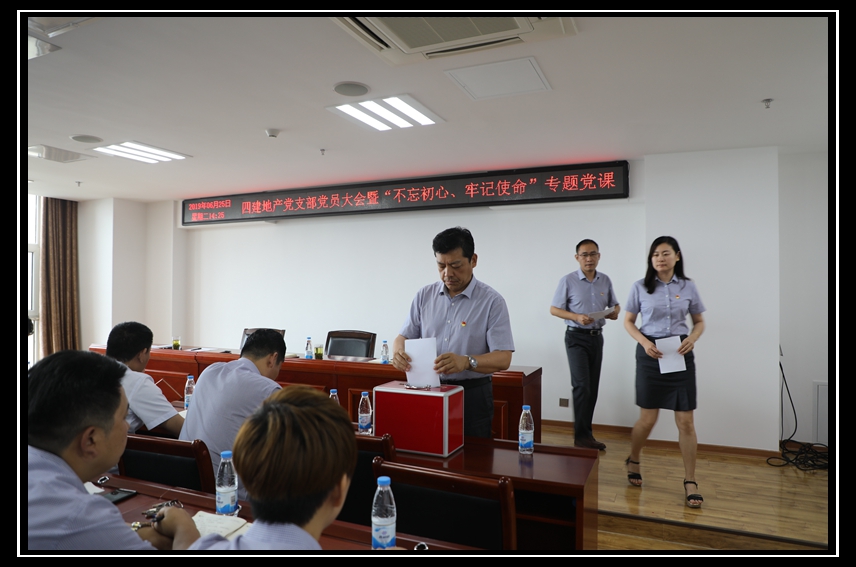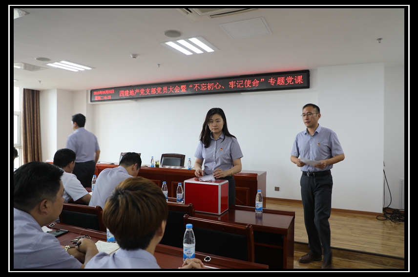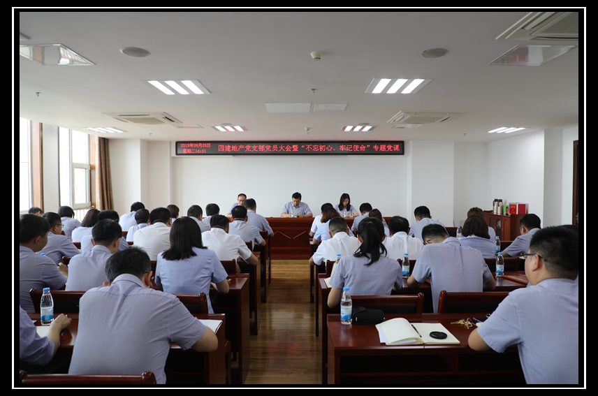 6月25日下午,四建地產黨支部在美林大廈23樓大會議室召開全體黨員大會暨“不忘初心、牢記使命”專題黨課,黨支部全體黨員及部分群眾代表參加會議。