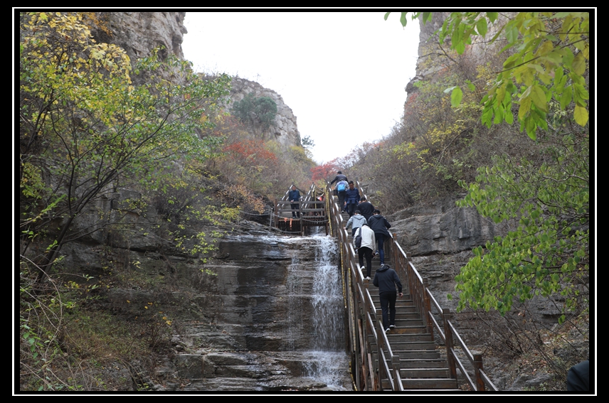 黃花溪設施完備,路線合理,從山下開始的三四公里的路程都能看到溪水流淌。黃花溪瀑布多達數十條,邁過溪水,首先映入眼簾的是“三合瀑”,由三股水匯在一起,好似一匹白練隨風飄揚,似霧非霧,然后落在下面的深潭里,水潭里泛起層層漣漪,瀑布注入深潭的那一瞬間,一朵朵白色的小花騰空而起,揚起銀珠一片。此處也是登頂的開始,一級一級的木棧道,直通到山頂紅旗處,一上一下的路線,平添了幾分樂趣,也增加了登山的難度。一路上,大家一邊徒步一邊欣賞沿途美麗的風景,相互幫助、互相鼓勵,在保證安全的基礎上向山頂進發。
