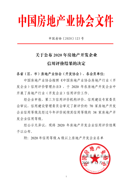 中國房地產業協會以《社會信用體系建設規劃綱要(2014-2020年)》和《國務院辦公廳關于加快推進社會信用體系建設、構建以信用為基礎的新型監管機制的指導意見》文件精神為指導,經國家發改委認可,開展了2020年度房地產開發企業信用評價工作。評級工作委托第三方信用評價機構,按照統一的評價標準,從開發建設、合同履約、產品質量、合法經營、社會責任等多維度對房地產開發企業信用狀況進行客觀公正評價。