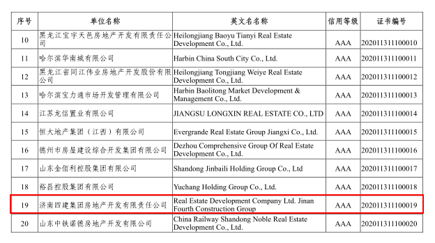 2020年12月1日,中國房地產業協會發布“中國房協【2020】123號”文件,公布2020年房地產開發企業信用等級評價結果,四建地產被評為“AAA”信用等級。