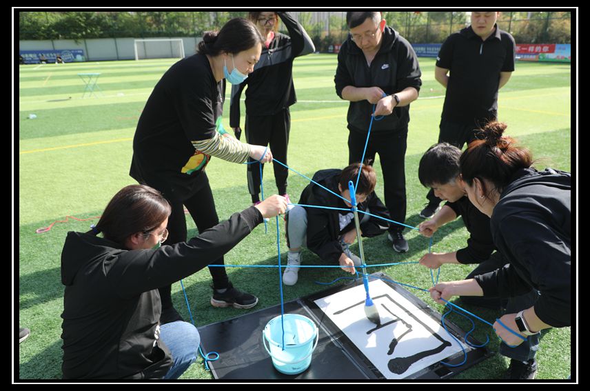 每輪比賽都精彩紛呈,熱鬧歡快,參賽選手精神飽滿,部門隊友加油助威,整個活動過程既充滿競賽的激烈又不失運動的趣味。最后的“神筆馬良”環節更是讓人拍案叫絕,每部門派出8名代表,將全部繩子綁在一根大毛筆上,然后每人控制一根繩子,在眾人齊力控制的基礎上揮動大毛筆在卡紙上寫出匠心的“匠”,面對高難度的活動要求,員工們斗志昂揚,積極溝通協調,紛紛在幾秒鐘時間內高效完成。此項運動不僅弘揚了五一勞動節的“工匠精神”,更彰顯了四建地產對“責任國企,品質筑家,匠心之作”的不懈追求。