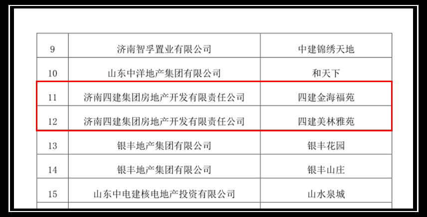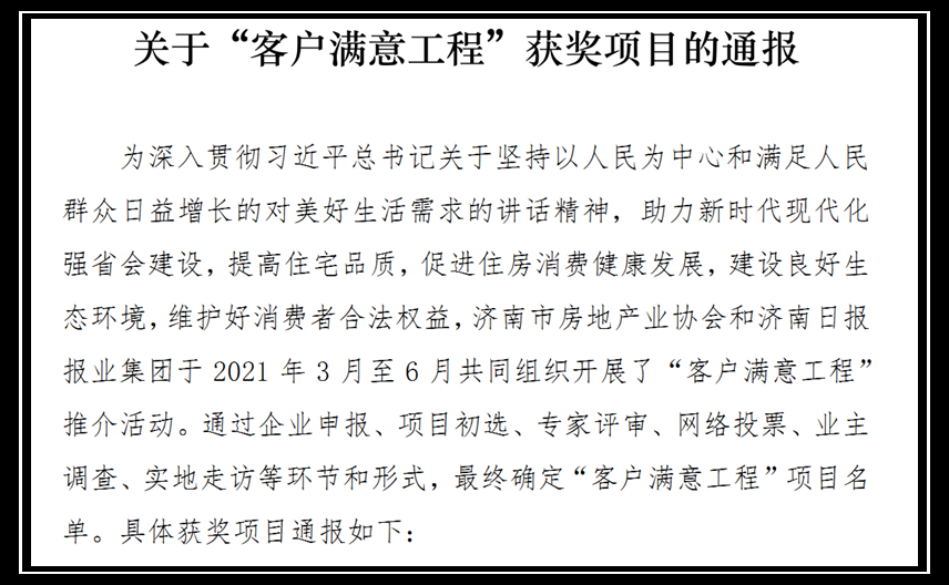 近日,濟(jì)南市房地產(chǎn)業(yè)協(xié)會(huì)發(fā)布了2021年度“客戶滿意工程”項(xiàng)目名單,由四建地產(chǎn)開發(fā)的四建金海福苑和四建美林雅苑項(xiàng)目榮獲濟(jì)南市客戶滿意工程。