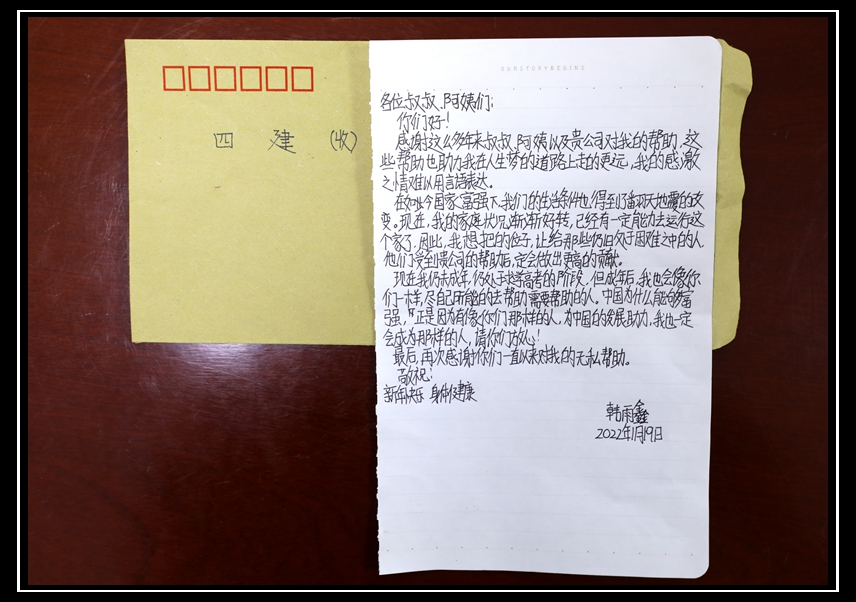 走訪慰問的四名學生中,韓雨鑫以推薦生的身份考上濟陽最好的高中聞韶中學,目前上高一,成績一直名列前茅,不善言談的他以感謝信的形式表達了對企業和關愛他的每一位人的感激之情,并在信里表示長大后也要成為像我們一樣的人,盡自己所能的幫助更多的人,為中國的發展助力。其中,李富奇、王浩和夏元春的成績都取得了新的突破,營銷部成員代表一如既往的為夏元春同學送去新年衣物和鞋,希望她勇往直前,砥礪前行,靜默成長。受訪學生家長對四建地產連續第八年的慰問深表謝意,并表示將幫助孩子順利完成學業,不辜負黨、社會和企業的期望,努力把孩子培養成才,將來回報社會。