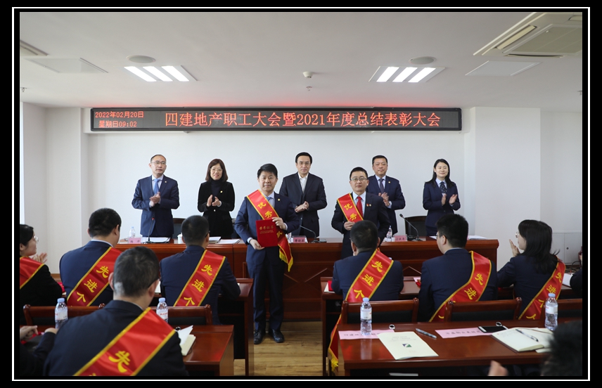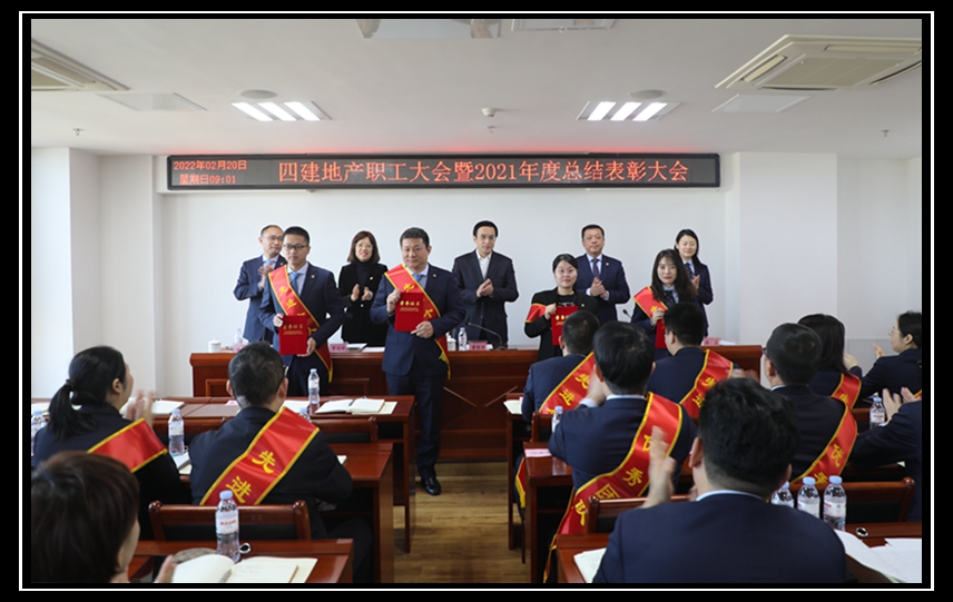 會議開始前,在集團人力資源部副部長經琦監督下,全體員工對中層以上領導干部進行了民主評議。隨后,四建地產黨支部副書記楊沖代表公司宣讀表彰決定,并對2021年度表現突出的12名優秀員工和2個先進團隊進行了表彰。