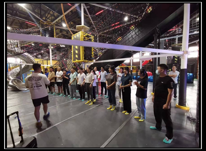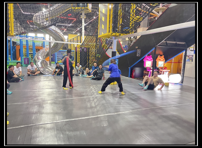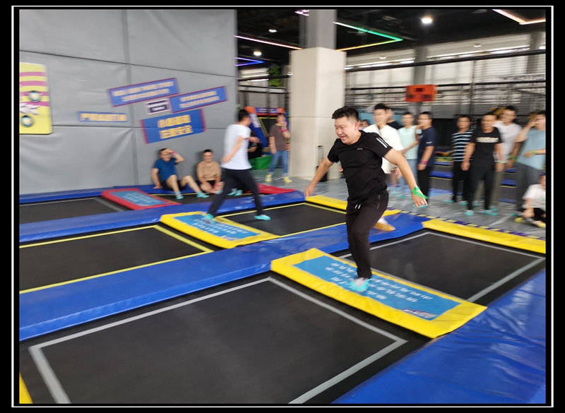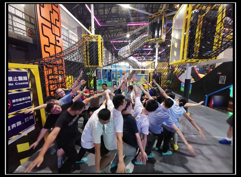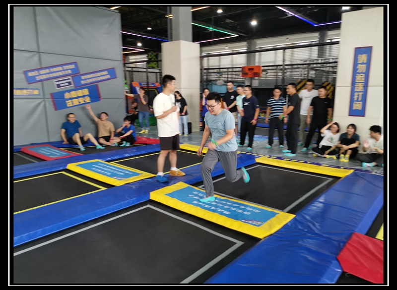 活動(dòng)開(kāi)始前,在游戲教練的引導(dǎo)下,雙方員工通過(guò)熱身小游戲快速融入團(tuán)隊(duì),增進(jìn)彼此的溝通和熟悉程度。接著,為增強(qiáng)游戲體驗(yàn)感,教練根據(jù)現(xiàn)場(chǎng)人數(shù)、男女比例,形成兩支隊(duì)伍,通過(guò)兵來(lái)將擋、躲避球、攔路虎、蹦床接力等方式,開(kāi)展對(duì)抗賽。在蹦床的角斗比賽環(huán)節(jié),每隊(duì)選出隊(duì)長(zhǎng)作為攔路虎,進(jìn)入對(duì)方賽道,游戲開(kāi)始時(shí),選手首先依次跳過(guò)蹦床到達(dá)攔路虎所在位置,與攔路虎進(jìn)行猜拳游戲,贏(yíng)家返回與下一位隊(duì)員擊掌接力,輸家則圍著攔路虎左右轉(zhuǎn)圈6次,再進(jìn)行猜拳直到勝利。這不僅考驗(yàn)選手本身的運(yùn)動(dòng)能力,更是考驗(yàn)團(tuán)隊(duì)配合力。隨著熟悉程度和游戲環(huán)節(jié)的層層推進(jìn),青年們?cè)诩佑吐暋g笑聲中盡情跳躍、奔跑,充分感受腳底傳來(lái)的十足彈力,充分釋放生活壓力和工作情緒,充分展現(xiàn)青年活力和自我風(fēng)采。幾輪比賽下來(lái),員工們即蹦出了活力,又凝聚了士氣,整個(gè)活動(dòng)現(xiàn)場(chǎng)都洋溢著熱烈、歡快的青春氣息。