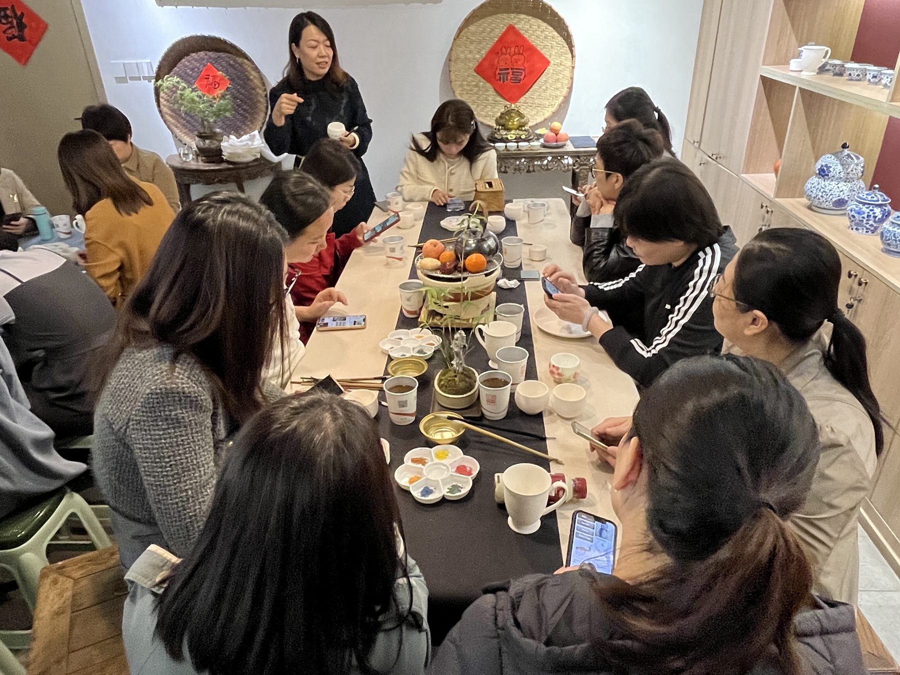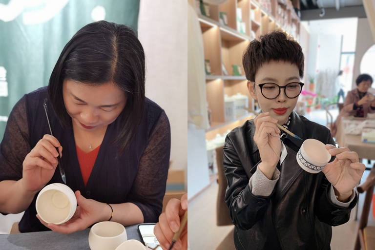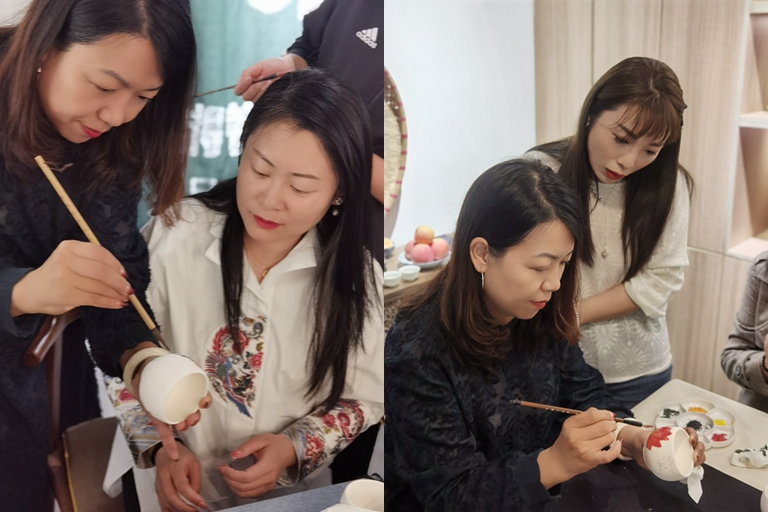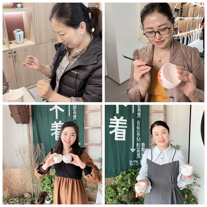 在老師的細致講解和示范下,地產(chǎn)的女員工們紛紛根據(jù)自身需求選擇合適的杯子、盤子開始了沉浸式創(chuàng)作。有的先用鉛筆描摹勾畫,后用顏料在杯子上填色繪制,或憨態(tài)可掬的兔子,或笑眼彎彎的卡通人物,或清新淡雅的梅花、菊花;有的直接蘸取顏料在茶杯表面、內(nèi)里、底座上親手描繪上自己喜歡的花鳥、山水、題詞。就這樣,經(jīng)過兩個小時的精細繪畫和老師的指導(dǎo)糾正,一個個原本還普通素白的海瓷杯就瞬間變得栩栩如生、生動形象。隨后女職工們開始互相欣賞、討論各自的作品,并與自己繪制的杯子拍照留念,現(xiàn)場氣氛十分融洽和諧。