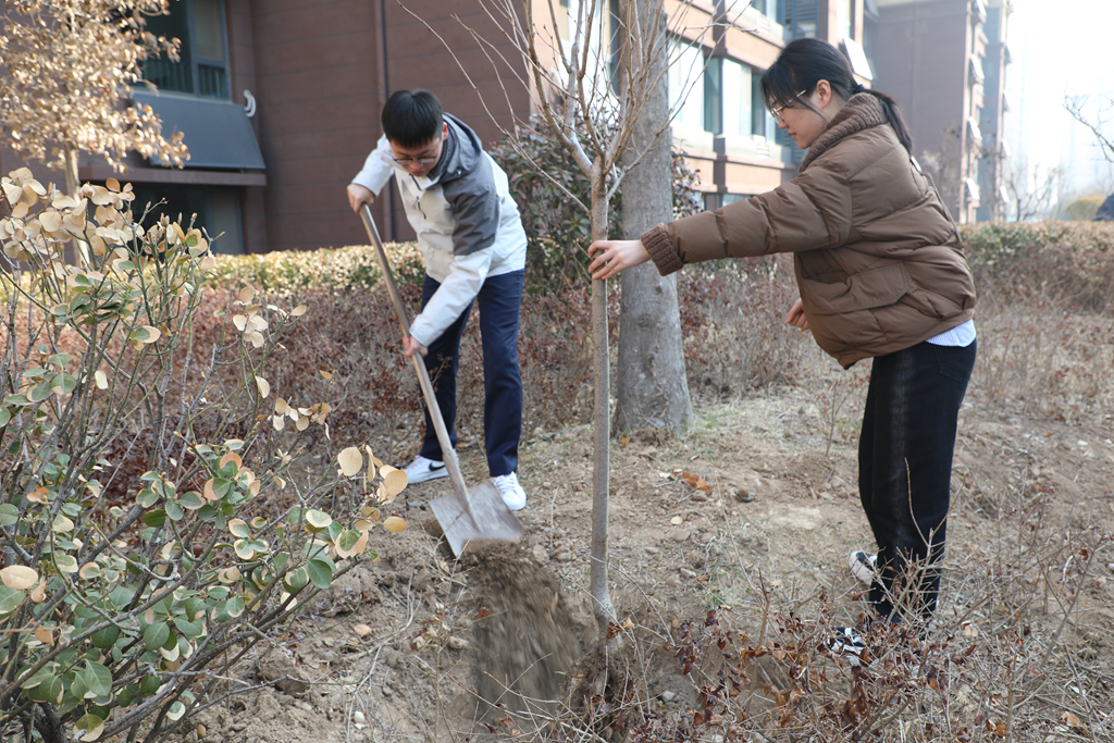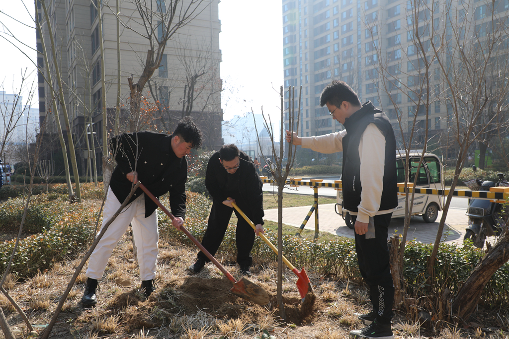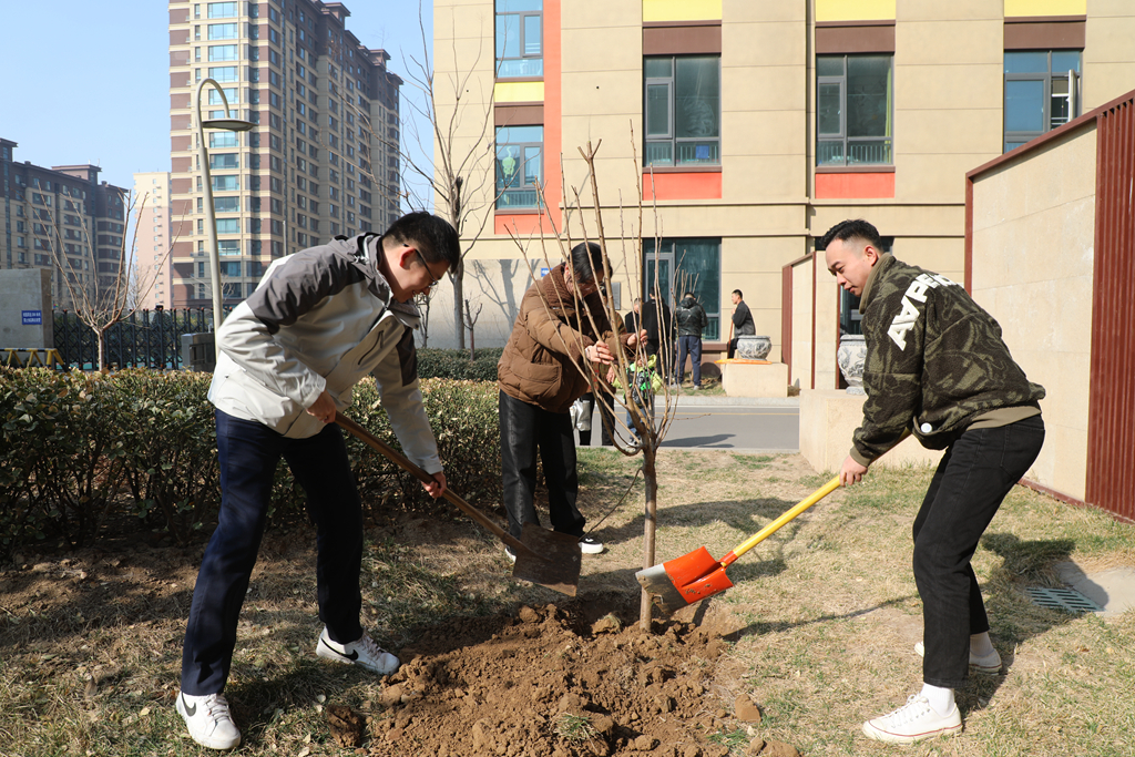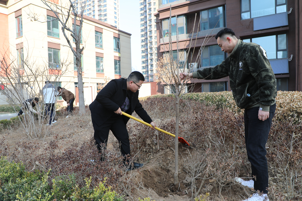 植一抹綠意,溢一片春光。植樹現場,青年們熱情高漲、干勁十足,三五成群地忙碌著,揮锨鏟土、扶苗填坑,每個動作都盡顯四建地產人的一絲不茍、團結有序。在現場員工的相互配合下,一株株樹苗在金海福苑小區里迎風而立、生機盎然,為初春的社區增添了一抹新綠。本次植樹,廣大青年們更是以功成不必在我的意識和主人翁的姿態,自覺化身綠化社區的參與者、踐行者。本次富有活力和成效的活動,既喚起了員工低碳環保綠色意識,也進一步增進了青年員工之間的交流協作。